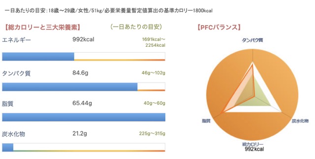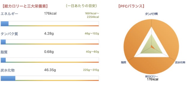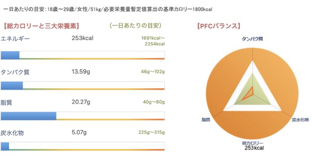 | 目標のPFC | タンパク質 16-33g | 脂質 10-12g | 炭水化物 54-64g | カロリー | 塩分 |