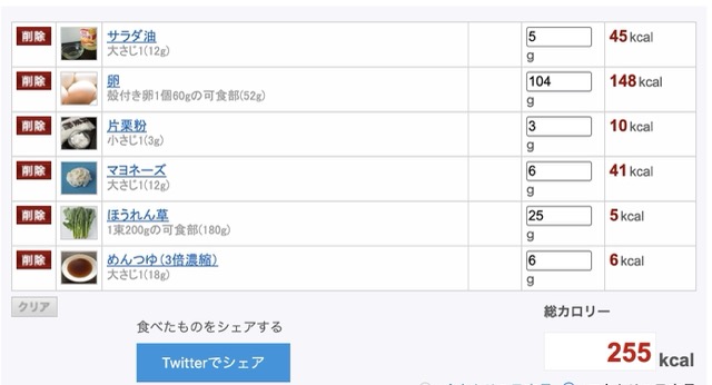 | ほうれん草の卵焼き | 4.5 | 6.8 | 16.9 | 84.3 | 0.4 |